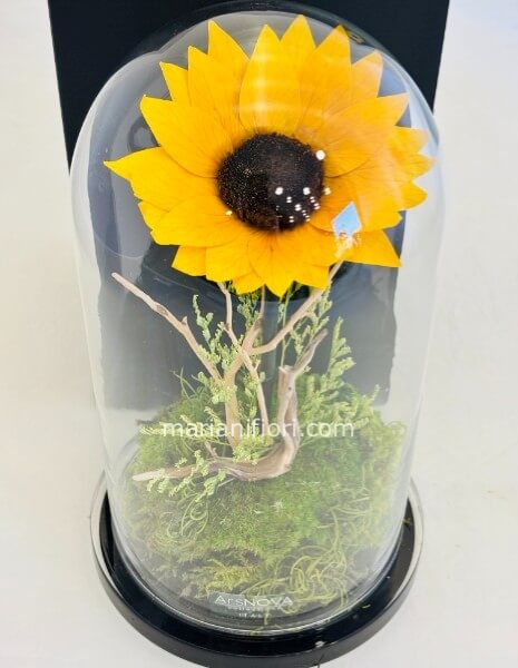 Novita, Girasole stabilizzato in teca in vetro con gambo e pesaggio vegetale, la base sotto è in Plexiglass altezza 35 cm