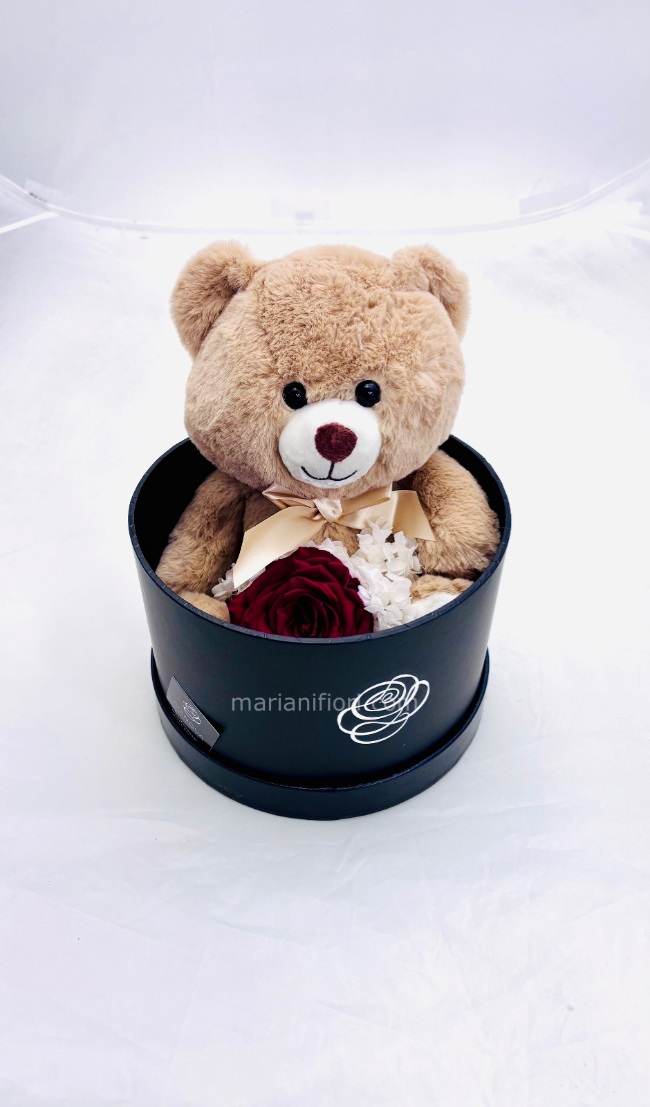 simpatico orso Trudi con rosa rossa stabilizzata ed ortenzia presentato in un elegante box nero ideale per un regalo dolce .